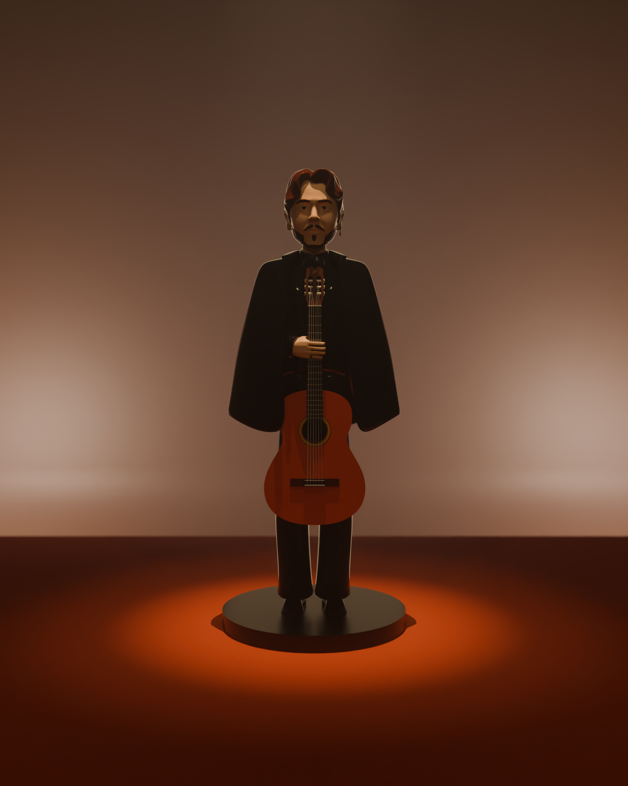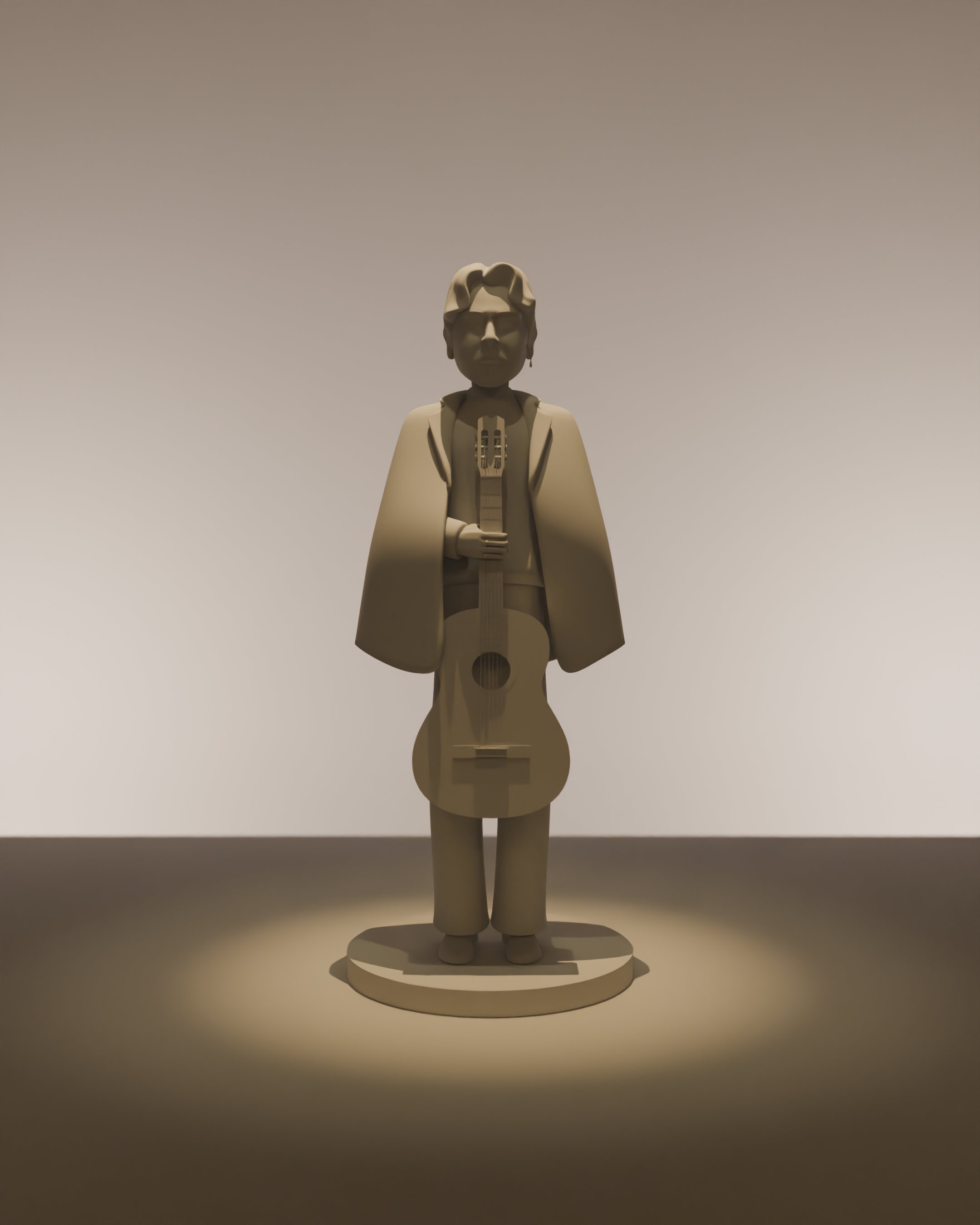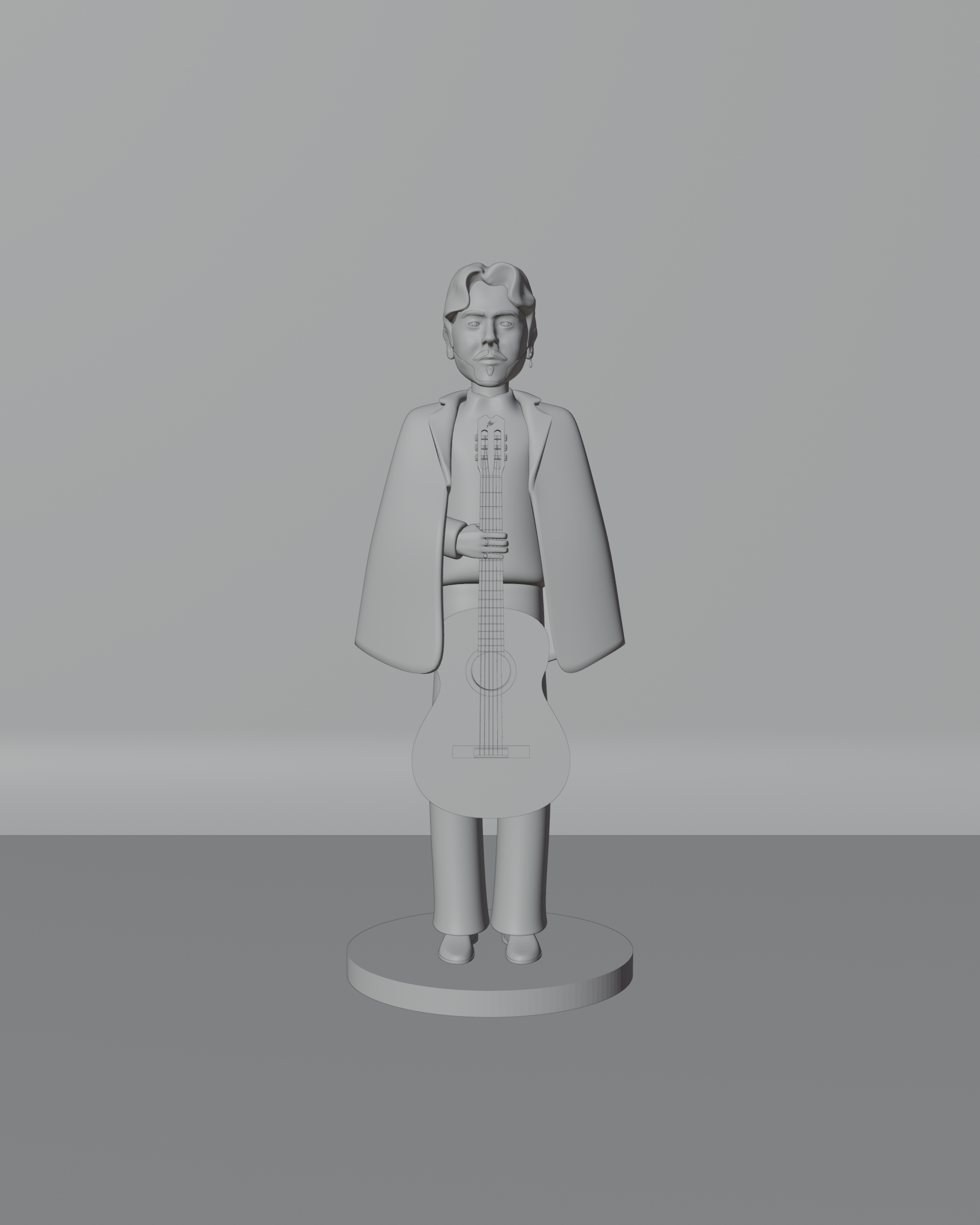 El modelado fue realizado en Blender, partiendo de un boceto tradicional para definir proporciones, gesto y estilo. Se optó por un diseño simplificado y estilizado, priorizando la pureza de las formas y la claridad de la silueta. El personaje se construyó a partir de volúmenes suaves, manteniendo una topología ordenada que favorece un acabado limpio y elegante. La guitarra actúa como elemento central, reforzando la identidad del personaje y su conexión con la música.