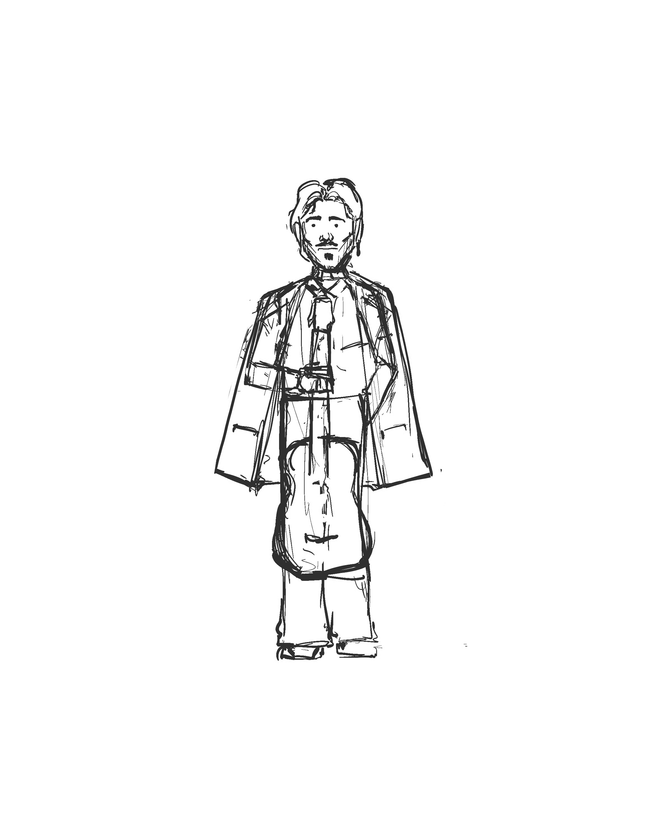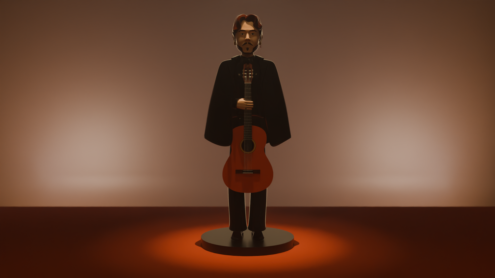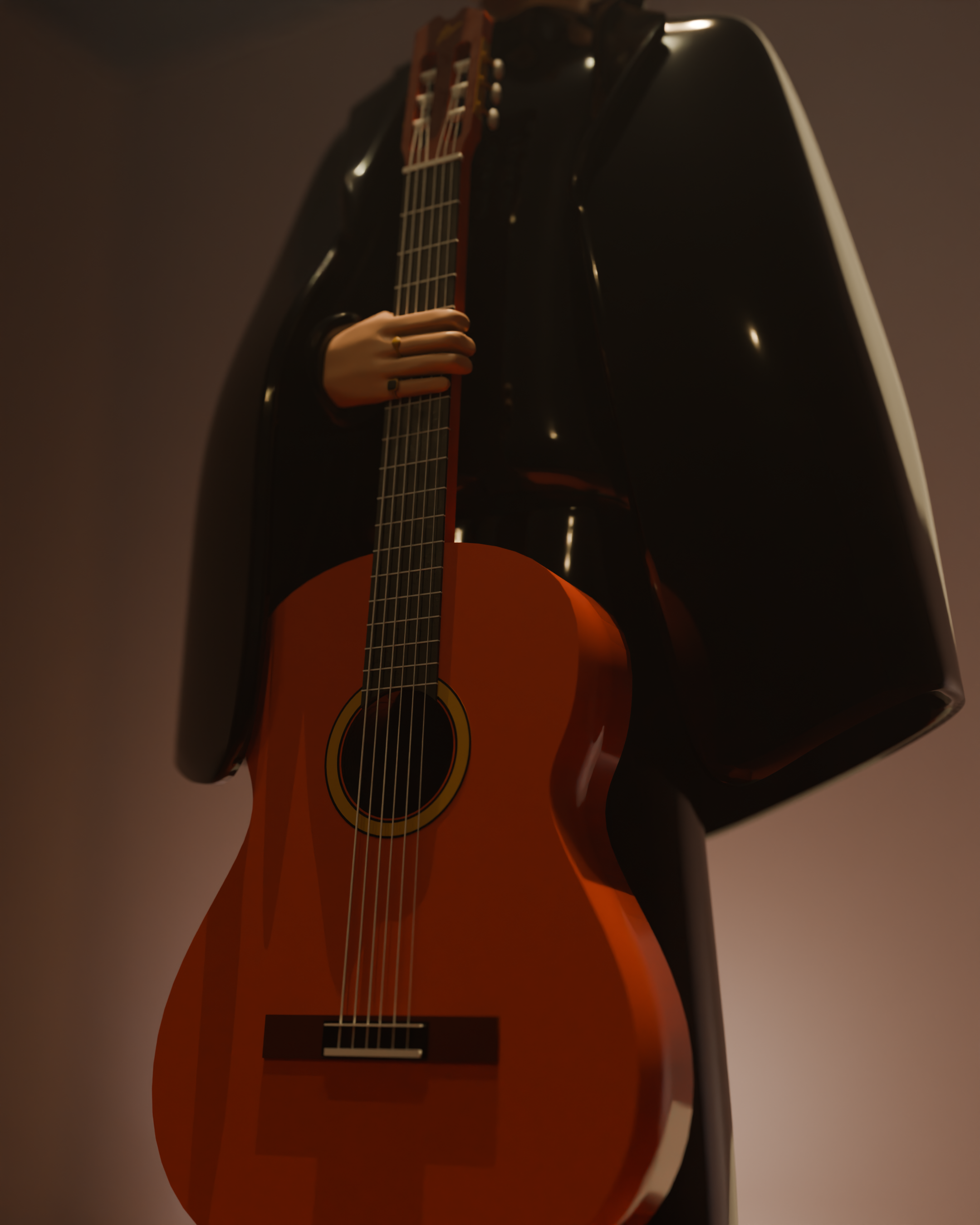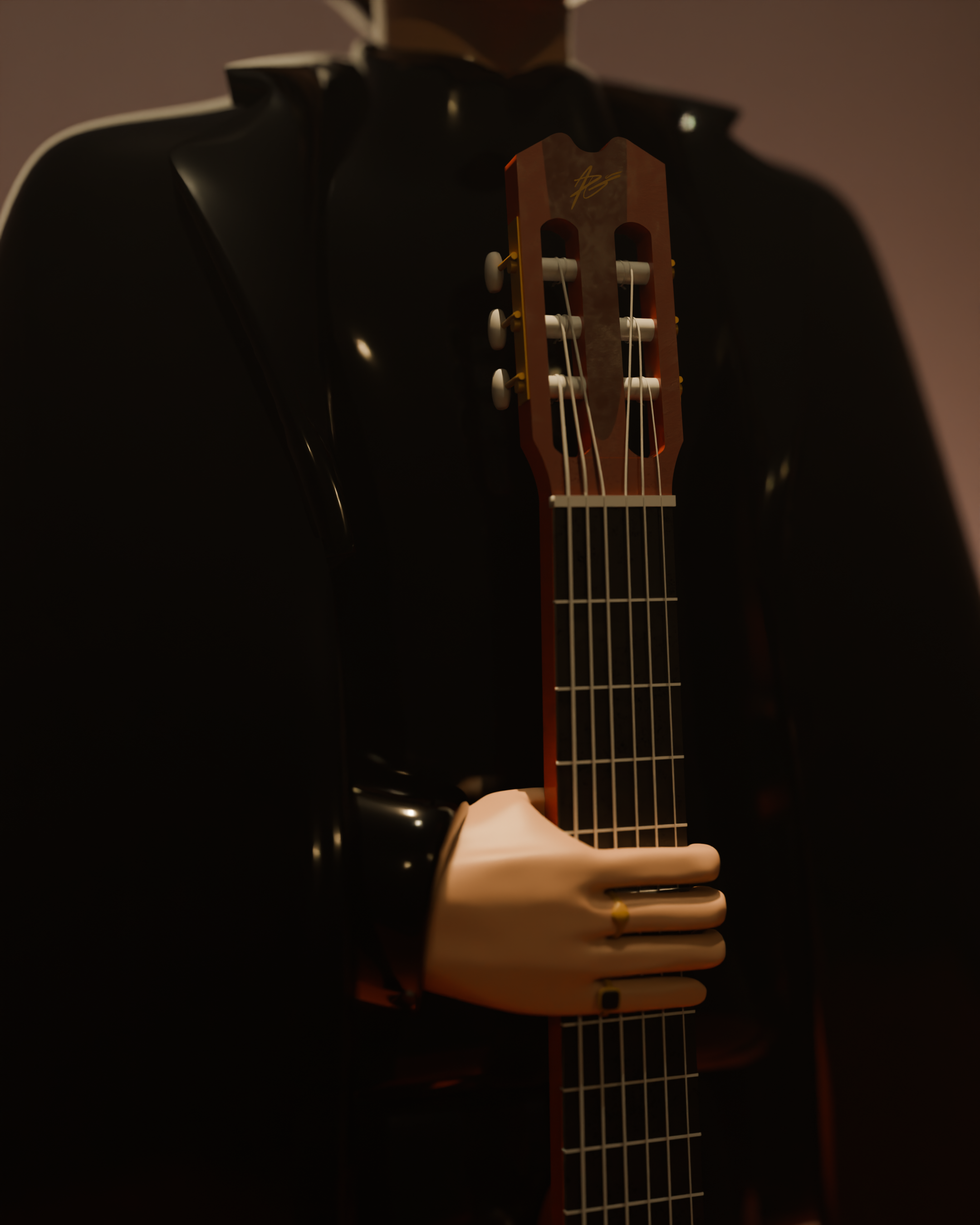 El modelado fue realizado en Blender, partiendo de un boceto tradicional para definir proporciones, gesto y estilo. Se optó por un diseño simplificado y estilizado, priorizando la pureza de las formas y la claridad de la silueta. El personaje se construyó a partir de volúmenes suaves, manteniendo una topología ordenada que favorece un acabado limpio y elegante. La guitarra actúa como elemento central, reforzando la identidad del personaje y su conexión con la música.